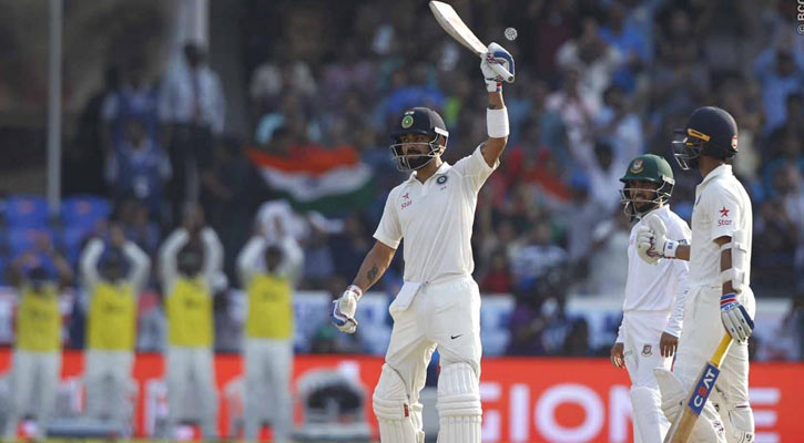 কোহলির ডাবল সেঞ্চুরি: তাইজুলের হাওয়ায় ভাসানো বল ঠিকমত টাইমিং করতে পারলেন না বিরাট কোহলি। কিন্তু বল চলে গেল এক্সট্রা কভার দিয়ে মাঠের বাইরে। ১৯৯ রানে থাকা কোহলি পৌঁছে গেলেন ২০৩ এ। চতুর্থ ডাবল সেঞ্চুরির স্বাদ পেলেন কোহলি। ক্রিকেট ইতিহাসের প্রথম ব্যাটসম্যান হিসেবে কোহলি টানা চার টেস্ট সিরিজে চারটি ডাবল সেঞ্চুরি হাঁকানোর রেকর্ড গড়লেন। এর আগে ওয়েস্ট ইন্ডিজ, নিউজিল্যান্ড ও ইংল্যান্ড সিরিজে ডাবল সেঞ্চুরির ইনিংস খেলেন ভারতের অধিনায়ক। স্যার ডন ব্র্যাডম্যান ও রাহুল দ্রাবিড় টানা তিন টেস্ট সিরিজে তিনটি ডাবল সেঞ্চুরি করেছিলেন।