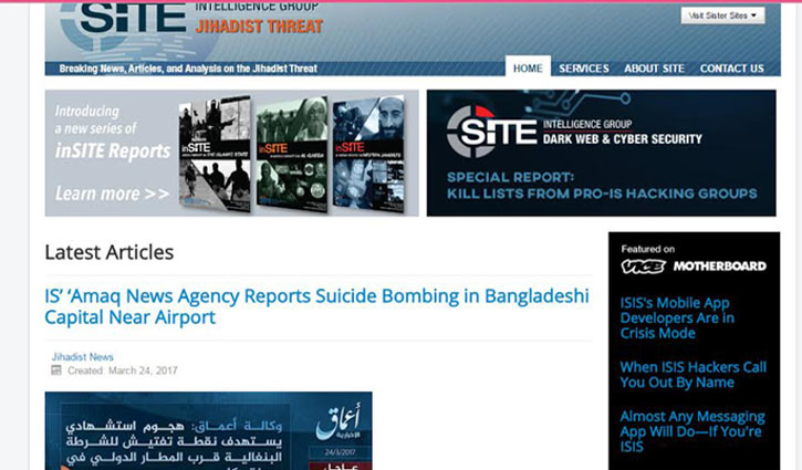 সাইট ইন্টিলিজেন্স বলছে, বাংলাদেশের রাজধানী ঢাকার বিমানবন্দরের পাশে পুলিশের একটি চেক পয়েন্টের পাশে পুলিশকে লক্ষ্য করে আইএস আত্মঘাতী হামলা চালিয়েছে।