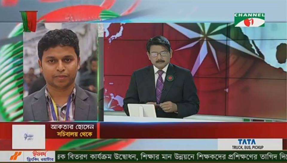 চ্যানেল আই’র পর্দায় লাইভ নিউজ আপডেট করছেন আক্তার হাবিব