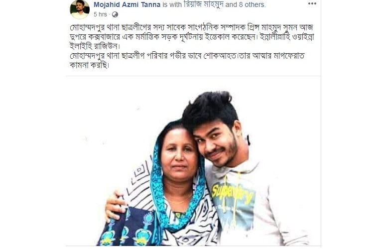 মোহাম্মদপুর থানা ছাত্রলীগের সদ্য সাবেক সাংগঠনিক সম্পাদক প্রিন্স মাহমুদ সুমন কক্সবাজার চকরিয়ায় সড়ক দুর্ঘটনায় নিহত হওয়া পরবর্তী জানাযা নামায আজ শুক্রবার বাদ জুম্মা মোহাম্মাদিয়া আশরাফুল মাদ্রাসা প্রাঙ্গণে অনুষ্ঠিত হয়েছে। নিহতের পরিবারের পক্ষ থেকে সুমনের জন্য সবার কাছে দোয়া প্রত্যাশা করা হয়েছে।