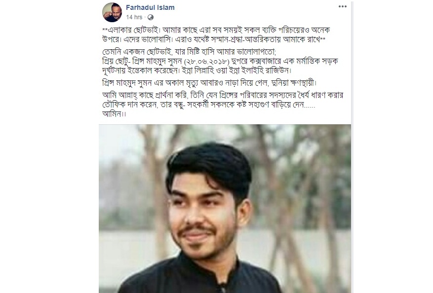এছাড়াও এলাকার অন্যতম গণ্যমান্য এবং সর্বজন শ্রদ্ধেয়, আন্তর্জাতিক খ্যাতি সম্পন্ন কর্পোরেট ট্রে’নার ফরহাদুল ইসলামের টাইমলাইনও নাড়া দিয়েছে অনেকের হৃদয়ে। তিনি সুমনের এই বিদায়ে যা লিখেছেন তা হুবহু তুলে ধরা হলো-