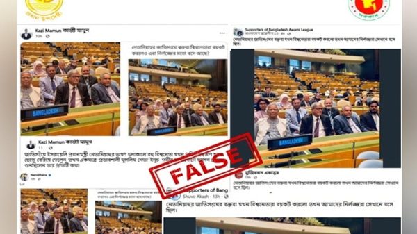 ছবির ক্যাপশনে স্পষ্টভাবে উল্লেখ করা হয়েছিল, ‘প্রধান উপদেষ্টা বক্তব্য দেওয়ার জন্য অপেক্ষমাণ।’ অথচ একই ছবি ব্যবহার করে সামাজিক যোগাযোগ মাধ্যমে ভুলভাবে প্রচার করা হয়েছে, যেন বাংলাদেশের প্রতিনিধিদল ওয়াকআউট না করে সভায় বসেছিল।