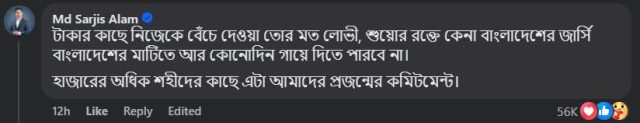 সাকিবের এই স্ট্যাটাসে কমেন্ট করেছেন জাতীয় নাগরিক পার্টির (এনসিপি) উত্তরাঞ্চলের মুখ্য সমন্বয়ক সারজিস আলম। তিনি লিখেছেন, টাকার কাছে নিজেকে বেঁচে দেওয়া তোর মতো লোভী, শুয়োর রক্তে কেনা বাংলাদেশের জার্সি বাংলাদেশের মাটিতে আর কোনোদিন গায়ে দিতে পারবে না।