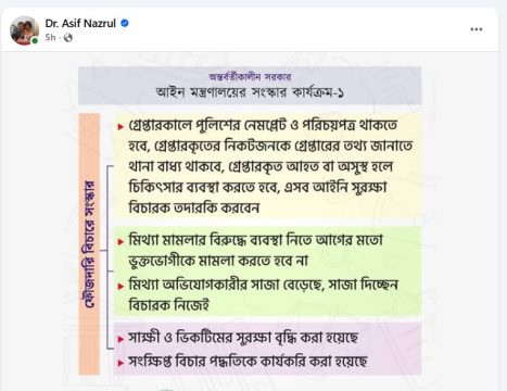 রোববার (৫ অক্টোবর) আইন উপদেষ্টা আসিফ নজরুল নিজের ভেরিফায়েড ফেসবুকে দেওয়া এক পোস্টে এ বিষয়টি নিশ্চিত করেছেন।
