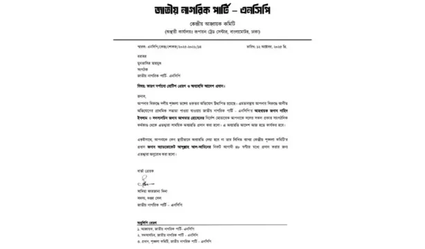 অব্যাহতির আদেশে বলা হয়েছে, আপনার বিরুদ্ধে দলীয় শৃঙ্খলাভঙ্গের গুরুতর অভিযোগ উত্থাপিত হয়েছে। এমতাবস্থায় আপনার বিরুদ্ধে আনীত অভিযোগের প্রাথমিক সত্যতা পাওয়া যাওয়ায় জাতীয় নাগরিক পার্টির (এনসিপি) আহ্বায়ক নাহিদ ইসলাম ও সদস্য সচিব আখতার হোসেনের নির্দেশ মোতাবেক আপনাকে দলের সব ধরনের সাংগঠনিক কর্মকাণ্ড থেকে এতদ্বারা সাময়িক অব্যাহতি প্রদান করা হলো। এ অব্যাহতি আদেশ আজ হতে কার্যকর হবে। একইসঙ্গে আপনাকে কেন স্থায়ীভাবে অব্যাহতি দেওয়া হবে না তার লিখিত ব্যাখ্যা কেন্দ্রীয় শৃঙ্খলা কমিটির প্রধান অ্যাডভোকেট আব্দুল্লাহ আল-আমিনের নিকট আগামী ৪৮ ঘণ্টার মধ্যে প্রদান করার জন্য এতদ্বারা অনুরোধ করা হলো।