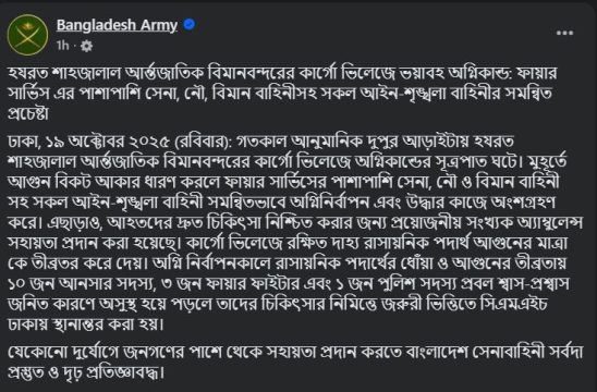 রোববার (১৯ অক্টোবর) সকালে দেওয়া পোস্ট বলা হয়, গতকাল (শনিবার) আনুমানিক দুপুর আড়াইটায় হযরত শাহজালাল আর্ন্তজাতিক বিমানবন্দরের কার্গো ভিলেজে অগ্নিকাণ্ডের সূত্রপাত ঘটে। মুহূর্তে আগুন বিকট আকার ধারণ করলে ফায়ার সার্ভিসের পাশাপাশি সেনা, নৌ ও বিমানবাহিনীসহ সকল আইন-শৃঙ্খলা বাহিনী সমন্বিতভাবে অগ্নিনির্বাপন এবং উদ্ধার কাজে অংশগ্রহণ করে।