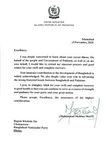হাসপাতালে চিকিৎসাধীন বিএনপি চেয়ারপারসন ও সাবেক প্রধানমন্ত্রী খালেদা জিয়ার সুস্থতা কামনা করে চিঠি পাঠিয়েছেন পাকিস্তানের প্রধানমন্ত্রী শাহবাজ শরিফ।