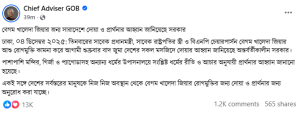 বৃহস্পতিবার (৪ ডিসেম্বর) সকালে প্রধান উপদেষ্টার ফেসবুক পেজে প্রকাশিত এক বিবৃতিতে এ আহ্বান জানানো হয়।