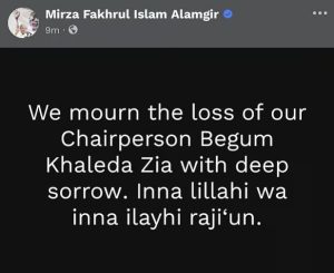 বিএনপির মহাসচিব মির্জা ফখরুল ইসলাম আলমগীর তাঁর ফেসবুকে দেওয়া পোস্টে বলেন, ‘আমরা গভীর দুঃখের সঙ্গে আমাদের চেয়ারপারসন বেগম খালেদা জিয়ার মৃত্যুতে শোকাহত। ইন্না লিল্লাহি ওয়া ইন্না ইলাইহি রাজিউন।’