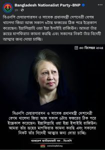 দলটির ভেরিফায়েড ফেসবুক পেজে খালেদা জিয়ার মৃত্যুর খবর জানিয়ে লেখা হয়, ‘বিএনপি চেয়ারপারসন ও সাবেক প্রধানমন্ত্রী দেশনেত্রী খালেদা জিয়া আজ সকাল ৬টায় ফজরের ঠিক পরে ইন্তেকাল করেছেন। ইন্না লিল্লাহি ওয়া ইন্না ইলাইহি রাজিউন। আমরা তাঁর রুহের মাগফিরাত কামনা করছি এবং সকলের নিকট তাঁর বিদেহী আত্মার জন্য দোয়া চাচ্ছি।’