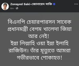 গণসংহতি আন্দোলনের প্রধান সমন্বয়কারী জোনায়েদ সাকি ফেসবুক পোস্টে লিখেছেন, ‘বিএনপি চেয়ারপারসন সাবেক প্রধানমন্ত্রী বেগম খালেদা জিয়া আর নেই! ইন্না লিল্লাহি ওয়া ইন্না ইলাইহি রাজিউন। তাঁর মৃত্যুতে আমরা গভীরভাবে শোকাহত!’