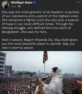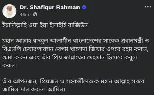 জামায়াতে ইসলামীর আমির শফিকুর রহমান ফেসবুকে লিখেছেন, ‘ইন্না লিল্লাহি ওয়া ইন্না ইলাইহি রাজিউন। মহান আল্লাহ রাব্বুল আলামীন বাংলাদেশের সাবেক প্রধানমন্ত্রী ও বিএনপি চেয়ারপারসন বেগম খালেদা জিয়ার ওপরে রহম করুন, ক্ষমা করুন এবং তাঁর প্রিয় জান্নাতের মেহমান হিসেবে কবুল করুন। তাঁর আপনজন, প্রিয়জন ও সহকর্মীদেরকে মহান আল্লাহ সবরে জামিল দান করুন। আমিন।’