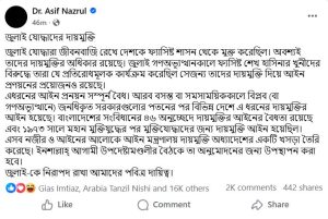 সবশেষে আইন উপদেষ্টা লিখেন, ‘জুলাই-কে নিরাপদ রাখা আমাদের পবিত্র দায়িত্ব।’