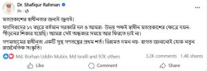পোস্টে জামায়াত আমির লিখেন, ‘মতপ্রকাশের স্বাধীনতার জন্যই জুলাই গণ–অভ্যুত্থান হয়েছিল। ফ্যাসিবাদের ১৭ বছরে বর্তমান সরকারি দল ও আমরা—উভয় পক্ষই স্বাধীন মতপ্রকাশের ক্ষেত্রে দমন-পীড়নের শিকার হয়েছি। আমরা সেই অন্ধকার সময়ে আর ফিরতে চাই না।’