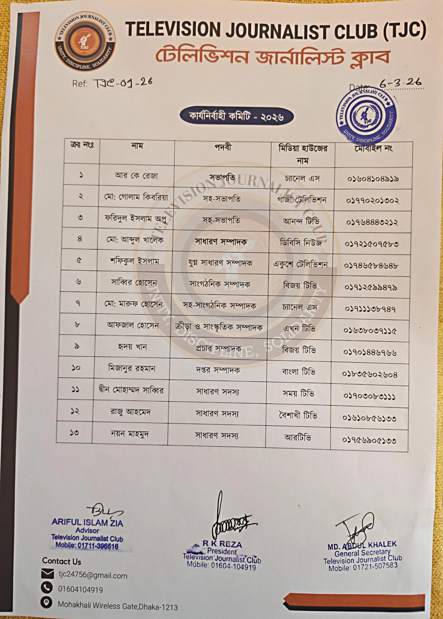 শুক্রবার রাতে রাজধানীর মগবাজারে আগামী এক বছরের জন্য একঝাঁক উদীয়মান টেলিভিশন সাংবাদিকদের সর্বসম্মতিক্রমে ১৩ সদস্য বিশিষ্ট কার্যনির্বাহী কমিটি-২০২৬ আনুষ্ঠানিকভাবে প্রকাশ করেন টেলিভিশন জার্নালিস্ট ক্লাবের উপদেষ্টা এবং বাংলাদেশ জাতীয়তাবাদী পেশাজীবী দলের সভাপতি আরিফুল ইসলাম জিয়া।