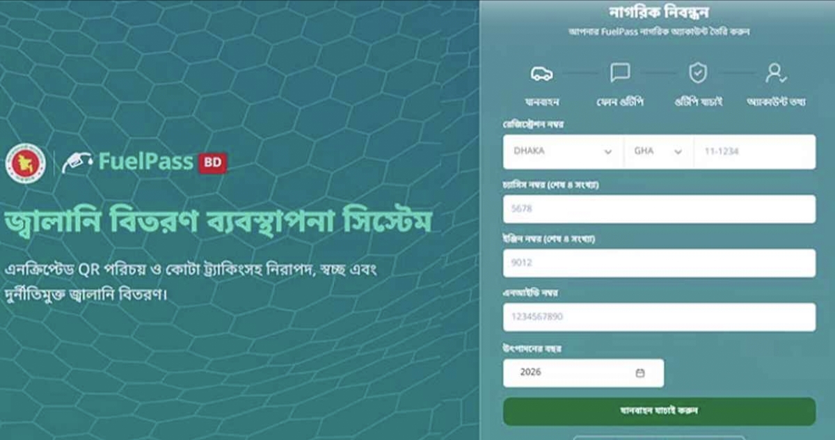 ফুয়েল পাসের জন্য সরকার ইতোমধ্যে একটি ওয়েবসাইট চালু করেছে। আবেদনকারীদের চার ধাপে অনলাইনে রেজিস্ট্রেশন সম্পন্ন করতে হবে। প্রথমে fuelpass.gov.bd ওয়েবসাইটে গিয়ে বিআরটিএর রেজিস্ট্রিশনকৃত গাড়ি ও মালিকের তথ্য দিতে হবে। যাচাই-বাছাইয়ের পর ফোনে ওটিপি (ওয়ান টাইম পাসওয়ার্ড) আসবে। এটিকে সাবমিট করে অ্যাকাউন্ট সংক্রান্ত তথ্য পূরণ করতে হবে।
